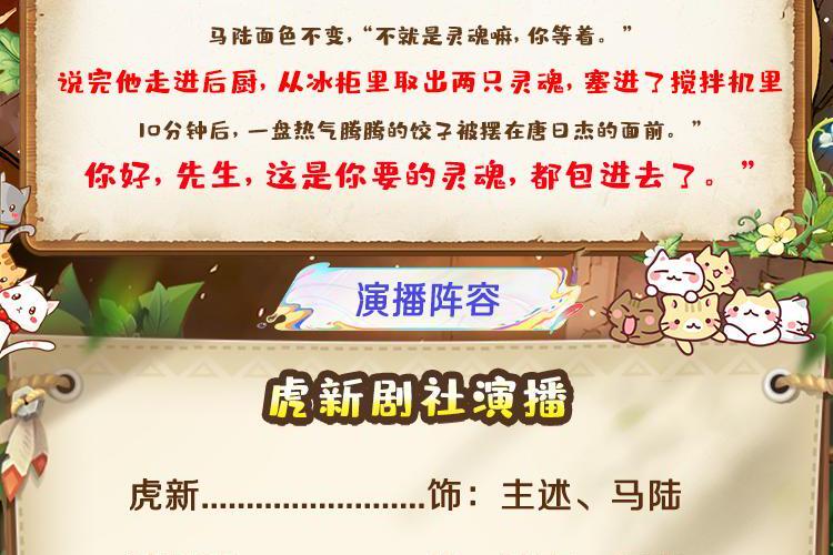 大神作家【小呆昭】作品 简介: 著名毒舌美食评论家唐日杰已经连干了三大碗饭,吃的满头大汗,却犹自嘴硬道。 “我承认你们店里的菜品都很好吃,色香味堪称完美,但是我还是要说,我没有在这些菜里吃到任何灵魂!而灵魂才是决定一道菜成败的关键!” 马陆面色不变,“不就是灵魂嘛,你等着。” 说完他走进后厨,从冰柜里取出两只灵魂,塞进了搅拌机里。 10分钟后,一盘热气腾腾的饺子被摆在唐日杰的面前。 ”你好,先生,这是你要的灵魂,都包进去了。”