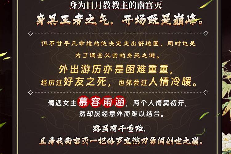 身为日月教教主的南宫灭,身具王者之气,开场既是巅峰。但不甘平凡命运的他决定走出舒适圈,同时也是为了调查父亲的身死之谜。外出游历亦是困难重重,经历过好友之死,也体会过人情冷暖。偶遇女主慕容雨涵,两个人情窦初开,然却屡经意外而难以结合。路虽有千重险,且看我南宫灭一把修罗鬼煞刀勇闯创世之巅。