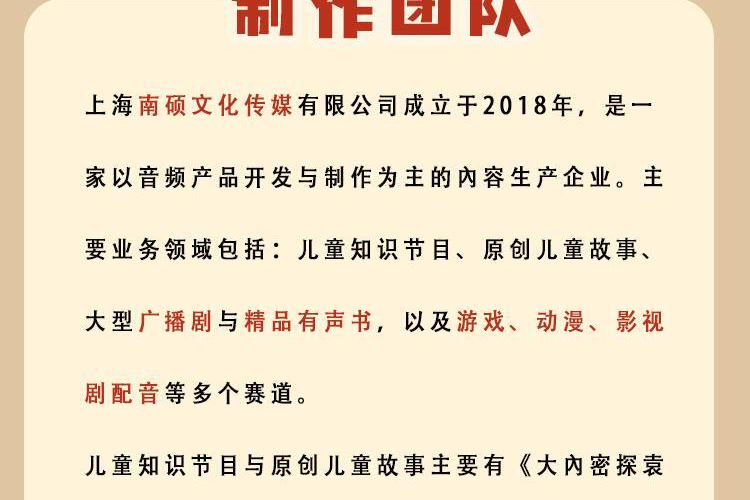 南硕简介 上海南硕文化传媒有限公司成立于2018年,创始人张大鹏。是一家具备音频全产业链服务能力的制作公司。公司具备导演、编剧、后期、配音演员、教师及教务等多个团队。主营业务包括四大板块:广播剧&有声书策划及制作、儿童音频节目制作、动漫游戏影视配音及技能教育等。