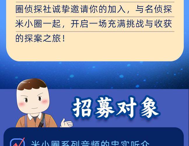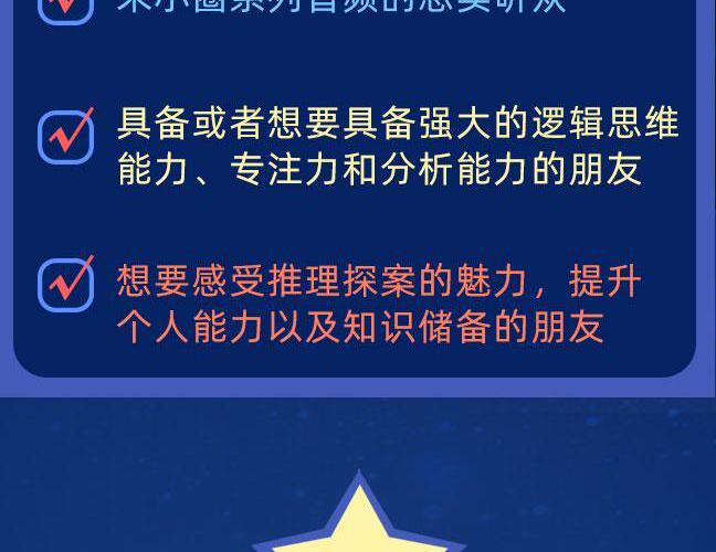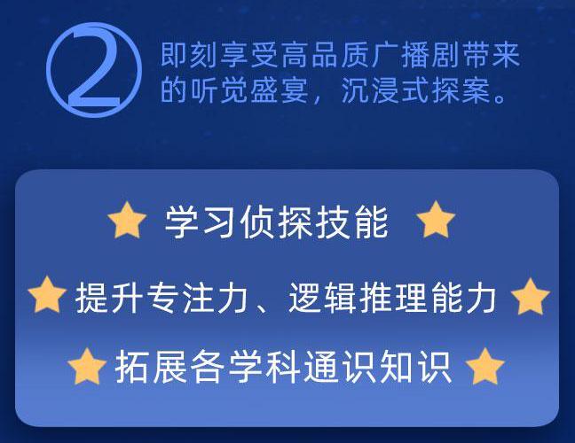 本节目适合9岁以上听众收听!在充满悬念的推理故事中激发思考潜能,培养逻辑思维!故事纯属虚构,寓教于乐。「本节目纯属虚构!节目中出现的人物,人名, 地名 ,机关 ,事件团体及背景等等皆与实际无关!特此声明」
