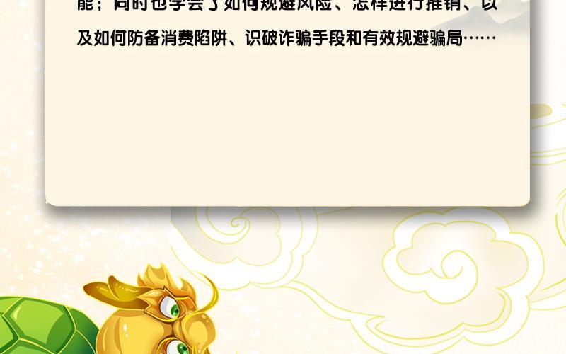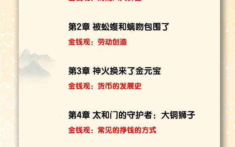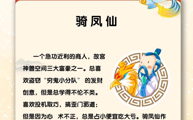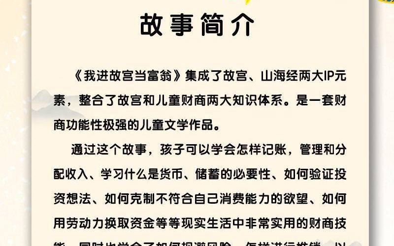 《我进故宫当富翁》集成了故宫、山海经两大IP元素,整合了故宫和儿童财商两大知识体系,是一套财商功能性极强的儿童文学作品。 通过这个故事,孩子可以学会怎样记账,管理和分配收入、学习什么是货币、储蓄的必要性、如何验证投资想法、如何克制不符合自己消费能力的欲望、如何用劳动力换取资金等等现实生活中非常实用的财商技能;同时也学会了如何规避风险、怎样进行推销、以及如何防备消费陷阱、识破诈骗手段和有效规避骗局。