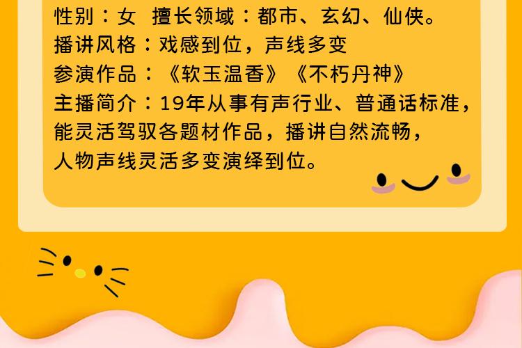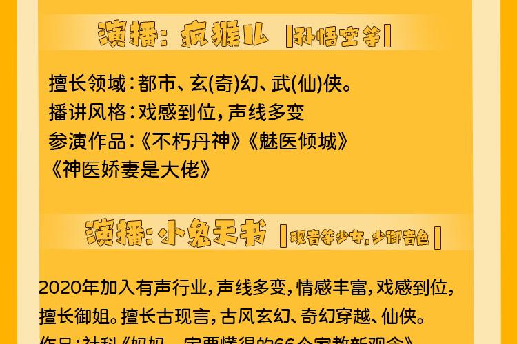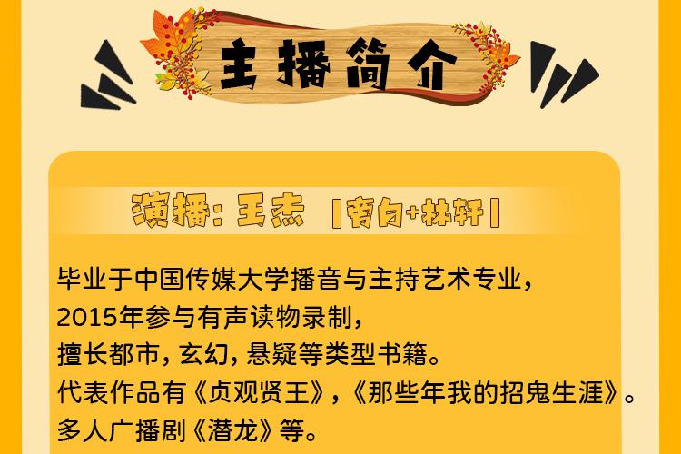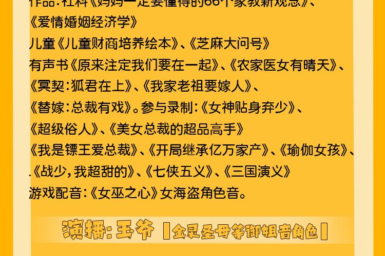 王杰,毕业于中国传媒大学播音与主持艺术专业,2015年参与有声读物录制,擅长都市,玄幻,悬疑等类型书籍。代表作品有《贞观贤王》《那些年我的招鬼生涯》。多人广播剧《潜龙》等。 疯猴儿:性别:男 擅长领域:都市、玄(奇)幻、武(仙)侠。播讲风格:戏感到位,声线多变 参演作品:《不朽丹神》《魅医倾城》《神医娇妻是大佬》 小兔天书:2020年加入有声行业,声线多变,情感丰富,戏感到位,擅长御姐。擅长古现言,古风玄幻、奇幻穿越、仙侠。 作品:社科《妈妈一定要懂得的66个家教新观念》、《爱情婚姻经济学》 儿童《儿童财商培养绘本》、《芝麻大问号》 有声书《原来注定我们要在一起》、《农家医女有晴天》、《冥契:狐君在上》、《我家老祖要嫁人》、《替嫁:总裁有戏》 参与录制:《女神贴身弃少》、《超级俗人》、《美女总裁的超品高手》、《我是镖王爱总裁》、《开局继承亿万家产》、《瑜伽女孩》、《战少,我超甜的》、《七侠五义》、《三国演义》 游戏配音:《女巫之心》女海盗角色音。 玉爷:性别:女 擅长领域:都市、玄幻、仙侠。播讲风格:戏感到位,声线多变 参演作品:《软玉温香》《不朽丹神》