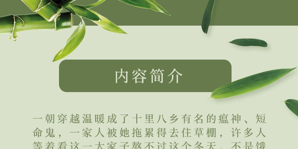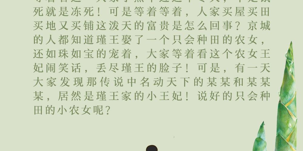 穿越架空、古言、种田、 HE结局。 本书每日上午更新5集,订阅收听不迷路! 【故事简介】 一朝穿越温暖成了十里八乡有名的瘟神、短命鬼,一家人被她拖累得去住草棚,许多人等着看这一大家子熬不过这个冬天,不是饿死就是冻死!可是等着等着,人家买屋买田买地又买铺这泼天的富贵是怎么回事?京城的人都知道瑾王娶了一个只会种田的农女,还如珠如宝的宠着,大家等着看这个农女王妃闹笑话,丢尽瑾王的脸子!可是,有一天大家发现那传说中名动天下的某某和某某某,居然是瑾王家的小王妃!说好的只会种田的小农女呢?