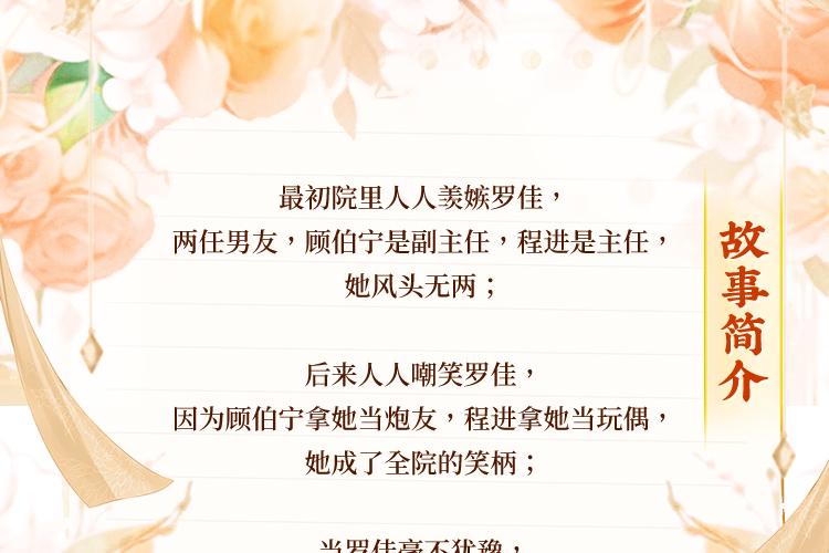 最初院里人人羡嫉罗佳,两任男友,顾伯宁是副主任,程进是主任,她风头无两;后来人人嘲笑罗佳,因为顾伯宁拿她当炮友,程进拿她当玩偶,她成了全院的笑柄;当罗佳毫不犹豫,转身离开的那刻,只有程进和顾伯宁知道,到底谁才是小丑。