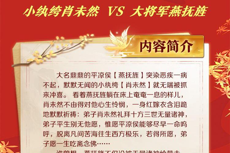 面冷心软平凉侯【燕抚旌】*人怂嘴贱小纨绔【肖未然】 大名鼎鼎的平凉侯燕抚旌突染恶疾一病不起,默默无闻的小纨绔肖未然就无端被抓来冲喜。 看着燕抚旌躺在床上奄奄一息的样儿,肖未然不由得对他心生怜悯,一身红嫁衣含泪跪地默默祈祷:弟子肖未然礼拜十方三世无量诸神,弟子平生别无他愿,惟愿平凉侯能够尽早一命呜呼,脱离凡间苦海往生西方极乐,若得所愿,弟子愿一生吃斋念佛…… 谁曾想,燕抚旌不仅没被无量诸神给带走,反而成婚当晚就生龙活虎的了,倒差点给肖未然气得一命呜呼。 再说这燕抚旌,此人虽天天在战场上摸爬滚打不懂风情,但好歹也深谙春宵苦短的道理,在他看来,病好不好的倒还不打紧,唯有这洞房才是顶要紧的头等大事,丝毫不可怠慢,是以成婚当晚便强着人行了周公之礼……