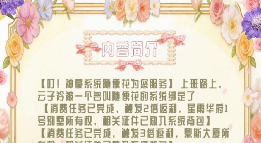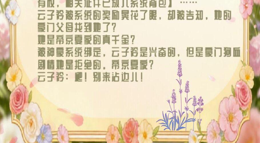 【叮!神豪系统随便花为您服务】 上班路上,云子衿被一个名叫随便花的系统绑定了。 【消费任务已完成,触发2倍返利,星雨华府1号别墅所有权,相关证件已放入系统背包】 【消费任务已完成,触发3倍返利,鼎斯大厦所有权,相关证件已放入系统背包】 …… 云子衿被系统的奖励晃花了眼,却被告知,她的豪门父母找到她了?她是帝京夏家的真千金? 被神豪系统绑定,云子衿是兴奋的,但是豪门狗血剧情她是拒绝的。 帝京夏家?云子衿:爬!别来沾边儿!