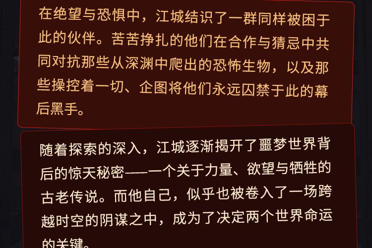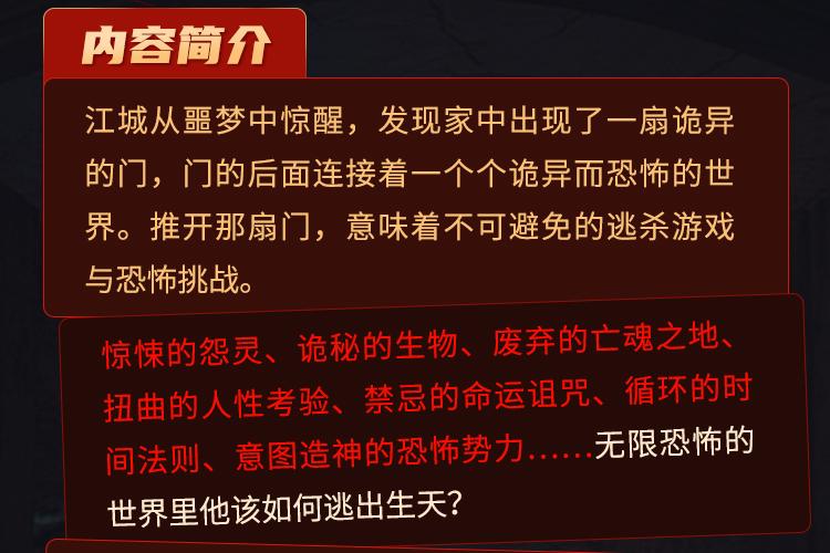 江城从噩梦中惊醒,发现家中出现了一扇诡异的门,门的后面连接着一个个诡异而恐怖的世界。推开那扇门,意味着不可避免的逃杀游戏与恐怖挑战。 惊悚的怨灵、诡秘的生物、废弃的亡魂之地、扭曲的人性考验、禁忌的命运诅咒、循环的时间法则、意图造神的恐怖势力……无限恐怖的世界里他该如何逃出生天? 在绝望与恐惧中,江城结识了一群同样被困于此的伙伴。苦苦挣扎的他们在合作与猜忌中共同对抗那些从深渊中爬出的恐怖生物,以及那些操控着一切、企图将他们永远囚禁于此的幕后黑手。 随着探索的深入,江城逐渐揭开了噩梦世界背后的惊天秘密——一个关于力量、欲望与牺牲的古老传说。而他自己,似乎也被卷入了一场跨越时空的阴谋之中,成为了决定两个世界命运的关键。