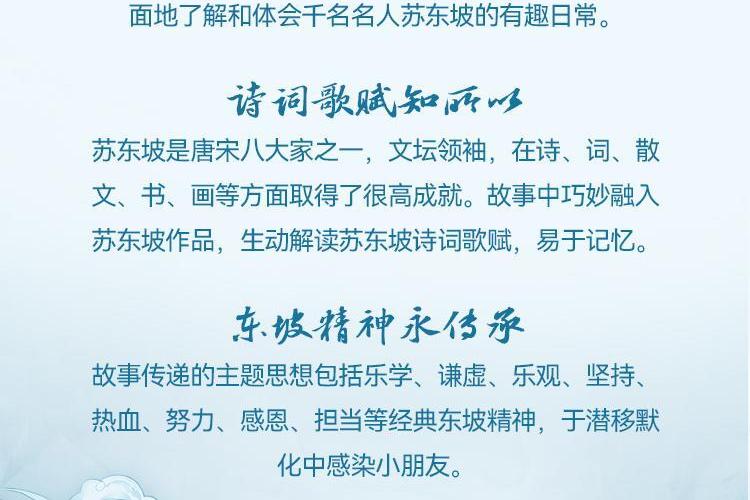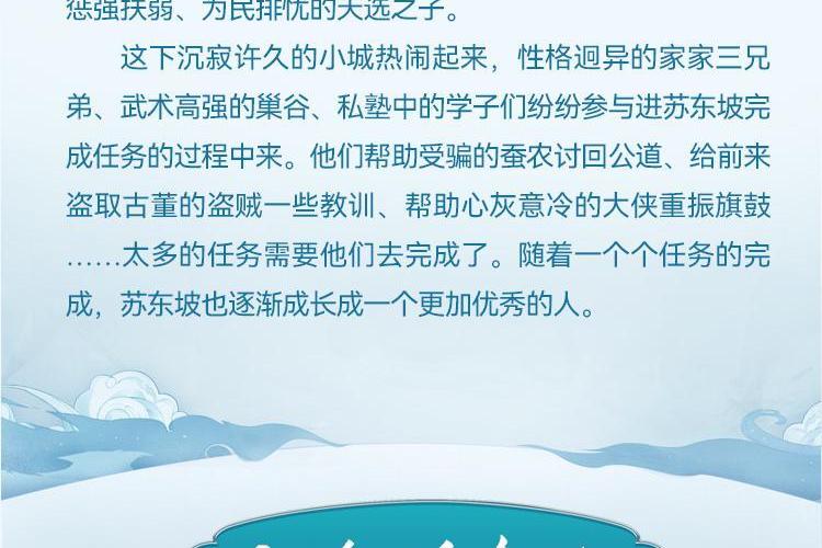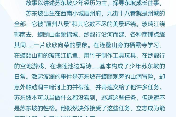 故事以讲述苏东坡少年经历为主,探寻东坡成长往事。苏东坡出生在西南小城眉州府,九街十八巷就是州城的全部,它被“眉州八景”和其它数不尽的美景环绕。玻璃江绕郭南去、蟆颐山坐眺锦城、纱行沿河而建、各种商铺点缀其间.....一片欣欣向荣的景象。在连鳌山旁的栖霞寺学习在蟆颐山前的玻璃江抓鱼、用竹子制作工具玩具、在纱行的空地游戏、在瑞莲池边写诗.....基本构成了少年苏东坡的日常。激起波澜的事件是苏东坡在蟆颐观旁的山洞冒险,却意外触动洞中暗河上的并蒂莲,并蒂莲交给了他许多任务苏东坡本可以当做什么都没看到,逃避这些任务,但逃避不是苏东坡的性格。他毅然决然接受了这些任务,立志成为能惩强扶弱、为民排忧的天选之子 这下沉寂许久的小城热闹起来,性格迥异的家家三兄弟、武术高强的巢谷、私塾中的学子们纷纷参与进苏东坡完成任务的过程中来。他们帮助受骗的蚕农讨回公道、给前来盗取古董的盗贼一些教训、帮助心灰意冷的大侠重振旗鼓太多的任务需要他们去完成了。随着一个个任务的完成,苏东坡也逐渐成长成一个更加优秀的人