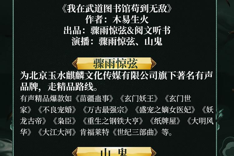 骤雨惊弦:为北京玉水麒麟文化传媒有限公司旗下著名有声品牌,走精品路线,有声精品爆款如《苗疆蛊事》、《玄门妖王》、《玄门世家》、《不良宠婚》、《万古最强宗》、《盛宠之嫡女医妃》、《妖龙古帝》、《枭臣》、《重生之钢铁大亨》、《纸牌屋》、《大明风华》、《大江大河》、肯福莱特《世纪三部曲》等。 山鬼:著名有声小说主播,曾用名莫言鬼语、墨名等。一个百变怪咖,时而诙谐,时而深沉,时而放浪形骸,时而优雅旷达。招魂楚些何嗟及,山鬼暗啼风雨。代表作《妖龙古帝》、《大泼猴》、《琅琊榜》、《娇娘医经》(为何合播)、《民国老兵志怪谈异》、《汉月天骄》、《泰戈尔诗集》、《儿童故事猫王》等。