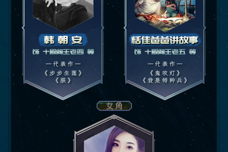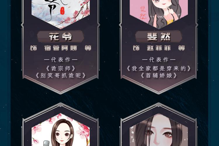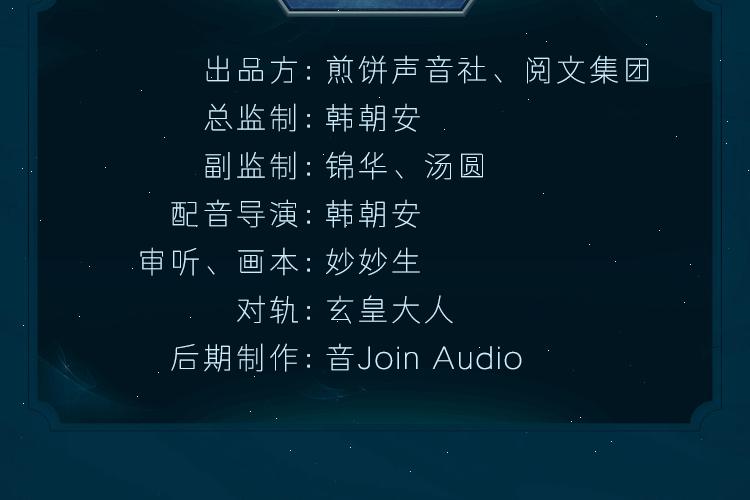 男角: 汤圆:饰演:旁白 代表作:《修真重生混都市》《星辰变》 小林子:饰演:苏然 代表作:《从前有座灵剑山》《丹道宗师》 韶华先生:饰演:张海生 等 代表作:《末世大回炉》《全能小相师》 鲁思熠:饰演:方圆 等 代表作:《我的黑月光女友》《贵妃娘娘求翻牌》 公子贺:饰演:十殿阎王老三 等 代表作:《国色芳华》《天才相师》《一步青云》 韩朝安:饰演:十殿阎王老四 等 代表作:《步步生莲》《朕》 恬佳爸爸讲故事:饰演:十殿阎王老五 等 代表作:《鬼吹灯》《我是特种兵》《东北往事-黑道风云二十年》 女角: 锦华:饰演:萧玲 代表作:《旺福小娘子》《后娘》 深白白:饰演:李小彤 等 代表作:《修仙女厨神》《王妃貌美她还凶》 帝繁音:饰演:女苏然/倩倩 等 代表作:《斗罗大陆 》系列《娇女毒妃》 花爷:饰演:宿管阿姨 等 代表作:《诡宗师》《别笑哥抓诡呢》 斐然:饰演:赵菲菲 等 代表作:《我全家都是穿来的》《首辅娇娘》 贰小呼:饰演:田清 等 代表作:《至尊狂妻》《八零娇妻是神医》 青柔:饰演:孔欣/李涛 等 代表作:《屌丝道士》《弃妃竟是王炸》 出品方:煎饼声音社 阅文集团 总监制:韩朝安 监制:锦华、汤圆 配音导演:韩朝安 审听、画本:妙妙生 对轨:玄皇大人 后期制作:音Join Audio