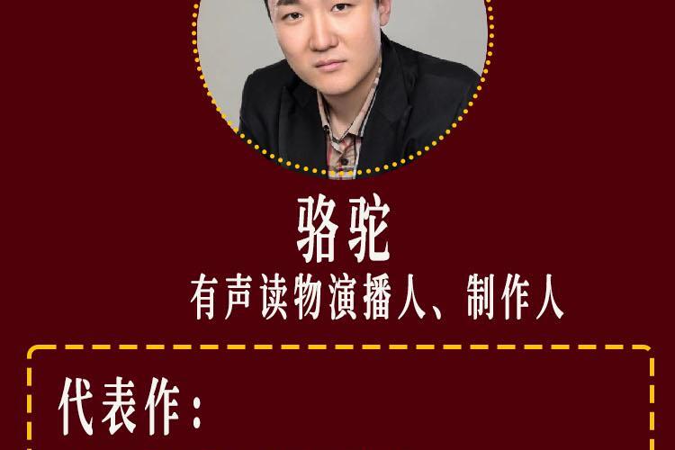 骆驼,有声小说制作人,配音导演。 2011年毕业于南京传媒学院(原中国传媒大学南广学院),曾就职于湖南人民广播节目金鹰之声。2012年开始从事有声书的演播,制作,版权开发等相关工作。作品全网点击量超过5亿次。喜马拉雅平台粉丝量180万。 代表作作品: 《法医秦明》系列、《古董局中局》系列、《默读》、《罪全书(十宗罪)》系列、《武则天》系列等。 2011年入选《中国当代主持人》杂志 2016年荣获沈阳都市广播沈阳都市广播“优秀演播者” 2017年演播作品《妖猫传》荣获当当阅读“金耳朵”奖 2020年荣获京东阅读“最受欢迎主播奖”