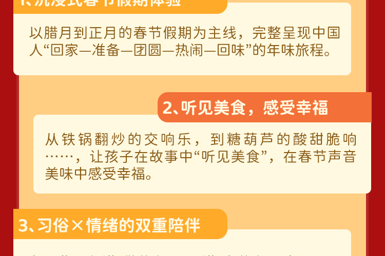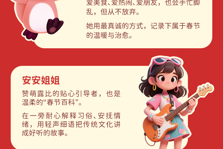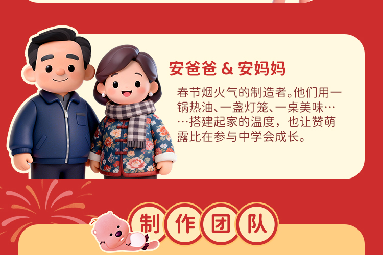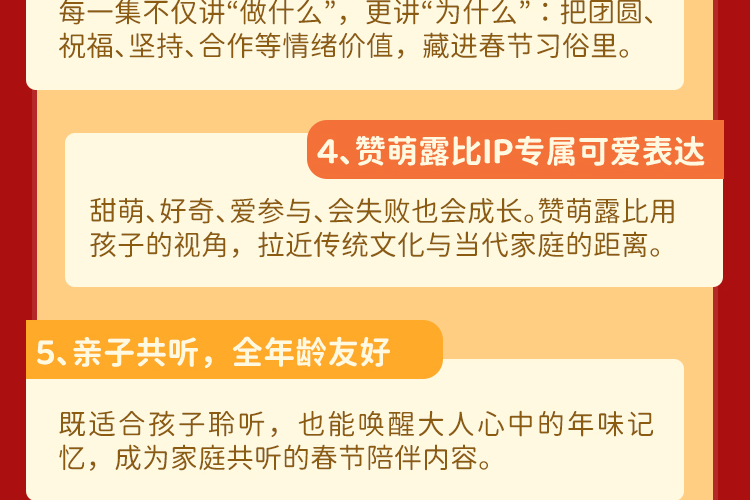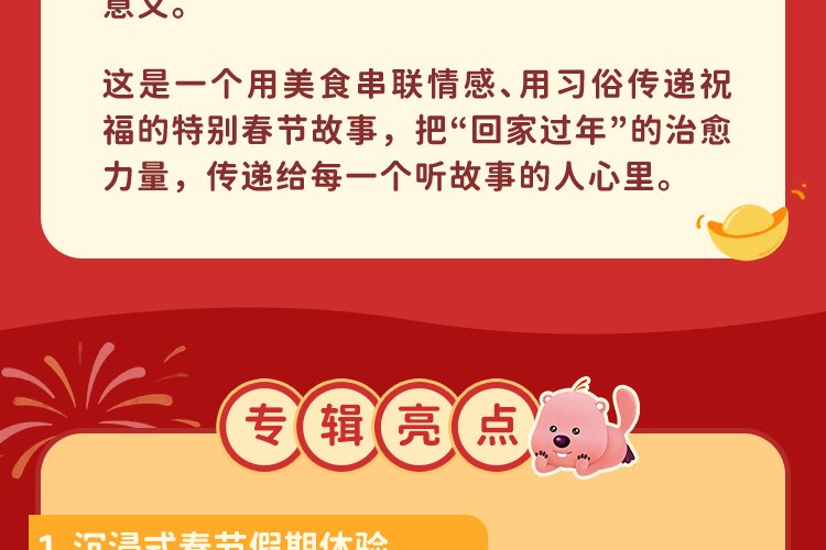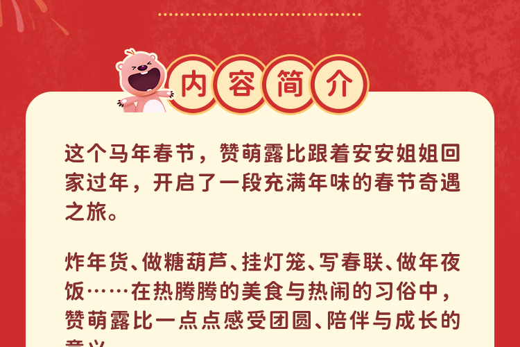 这个马年春节,赞萌露比跟着安安姐姐回家过年,开启了一段充满年味的春节奇遇之旅。 炸年货、做糖葫芦、挂灯笼、写春联、做年夜饭……在热腾腾的美食与热闹的习俗中,赞萌露比一点点感受团圆、陪伴与成长的意义。 这是一个用美食串联情感、用习俗传递祝福的特别春节故事,把“回家过年”的治愈力量,传递给每一个听故事的人心里。