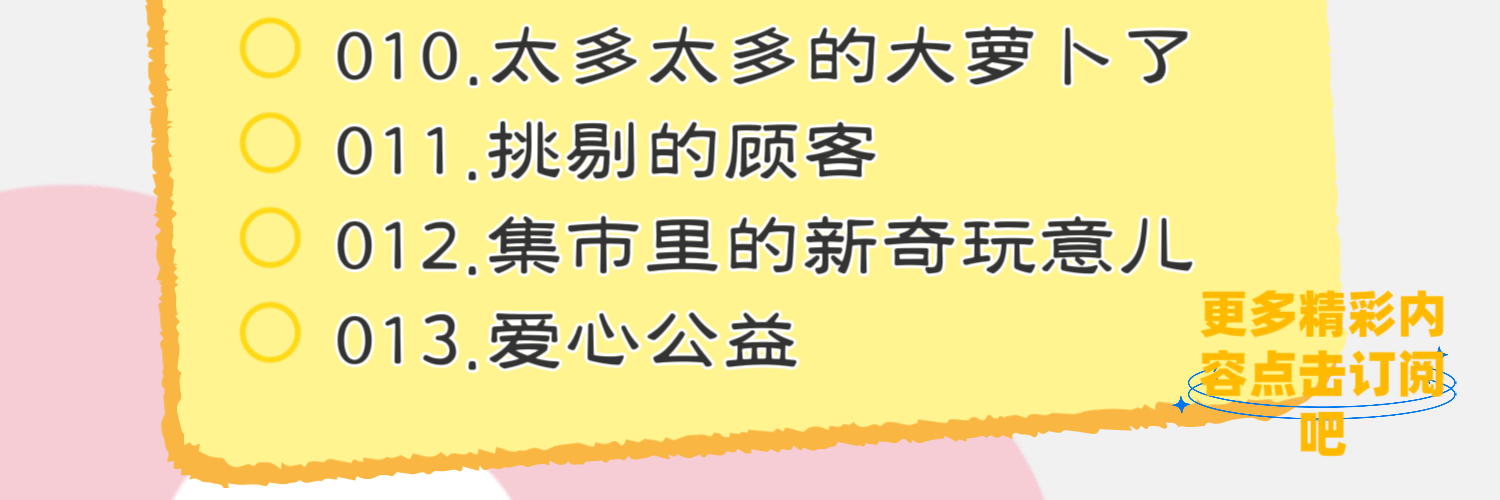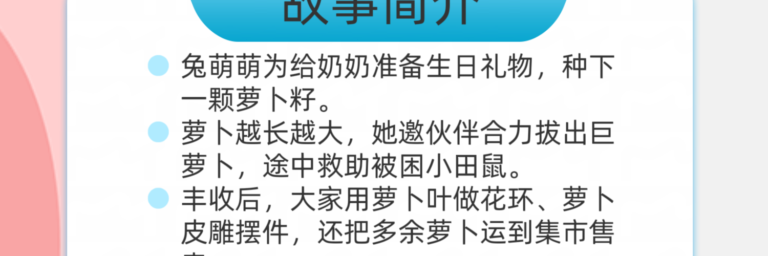 兔萌萌为了给奶奶准备超惊喜的生日礼物,小心翼翼种下了一颗小小的萝卜籽。没想到萝卜越长越大,变成了超级巨无霸!她赶紧喊来小伙伴们一起拔萝卜,途中还热心救助了被困的小田鼠。 大丰收后,大家脑洞大开,用翠绿的萝卜叶编漂亮花环,用红红的萝卜皮雕可爱小摆件。多余的萝卜还被运到集市卖掉,赚来的钱全用来给森林做公益啦!小动物们在嘻嘻哈哈的日常里,收获了满满的友情和快乐,上演了一出出温暖又搞笑的森林趣事!