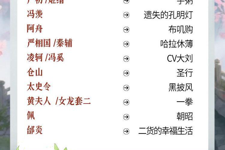 配音演员:影视作品《风起洛阳》《苍兰诀》《显微镜下的大明》《光荣与梦想》《夺冠》《冰糖炖雪梨》等 有声:《似锦》《韶光慢》《一品仵作》《玉无香》《逢春》等