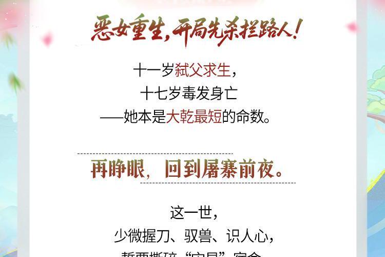 恶女重生,开局先杀拦路人! 十一岁弑父求生,十七岁毒发身亡——她本是大乾最短的命数。 再睁眼,回到屠寨前夜。 这一世,少微握刀、驭兽、识人心,誓要撕碎“灾星”宿命。 可天命棋盘上,帝王、将星、国师皆是玩家。 她偏要做那枚跳脱棋盘、斩落星辰的—— 破局之子!