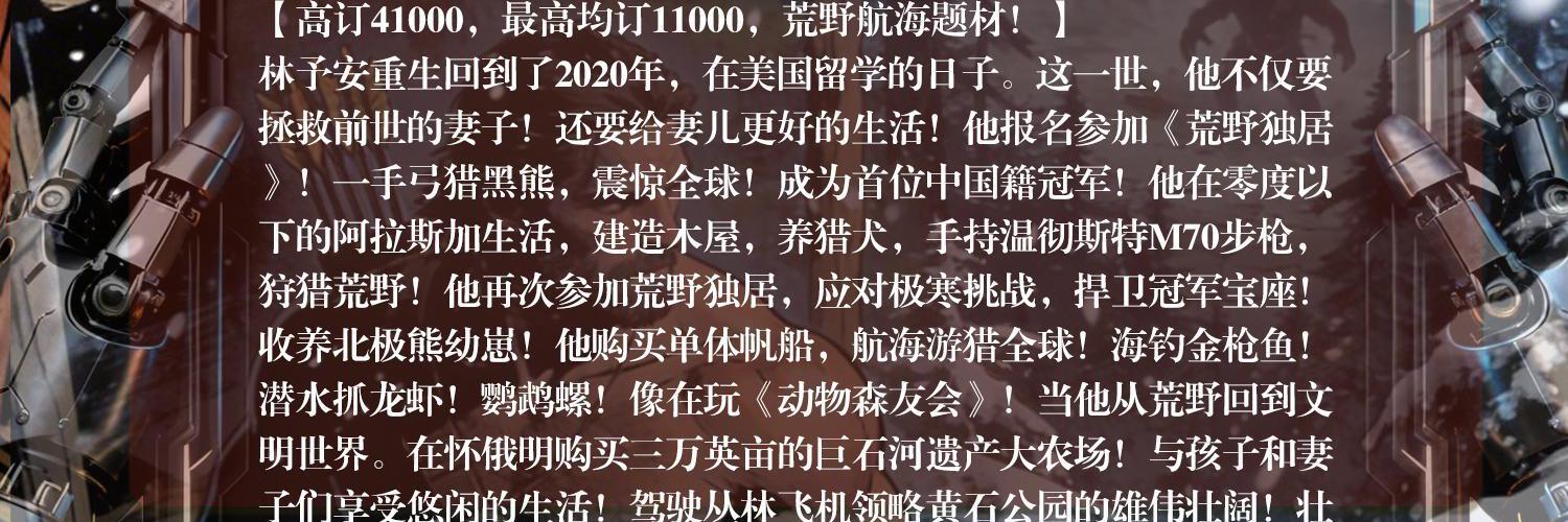 【美式种田打猎,农场,航海,养北极熊,网红,悠闲日常,荒野航海题材!】 林予安重生回到了2020年,在美国留学的日子。 这一世,他不仅要拯救前世的妻子!还要给妻儿更好的生活! 他报名参加《荒野独居》!一手弓猎黑熊,震惊全球!成为首位中国籍冠军! 他在零度以下的阿拉斯加生活,建造木屋,养猎犬,手持温彻斯特M70,狩猎荒野! 他再次参加荒野独居,应对极寒挑战,捍卫冠军宝座!收养北极熊幼崽! 他购买单体帆船,航海游猎全球!海钓金枪鱼!潜水抓龙虾!鹦鹉螺!像在玩《动物森友会》! 当他从荒野回到文明世界。 在怀俄明购买三万英亩的巨石河遗产大农场! 享受悠闲的生活! 驾驶丛林飞机领略黄石公园的雄伟壮阔! 成为拥有数百万粉丝的大网红!