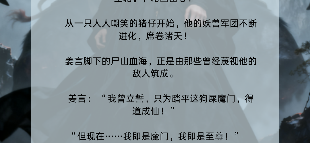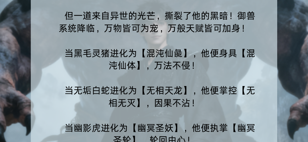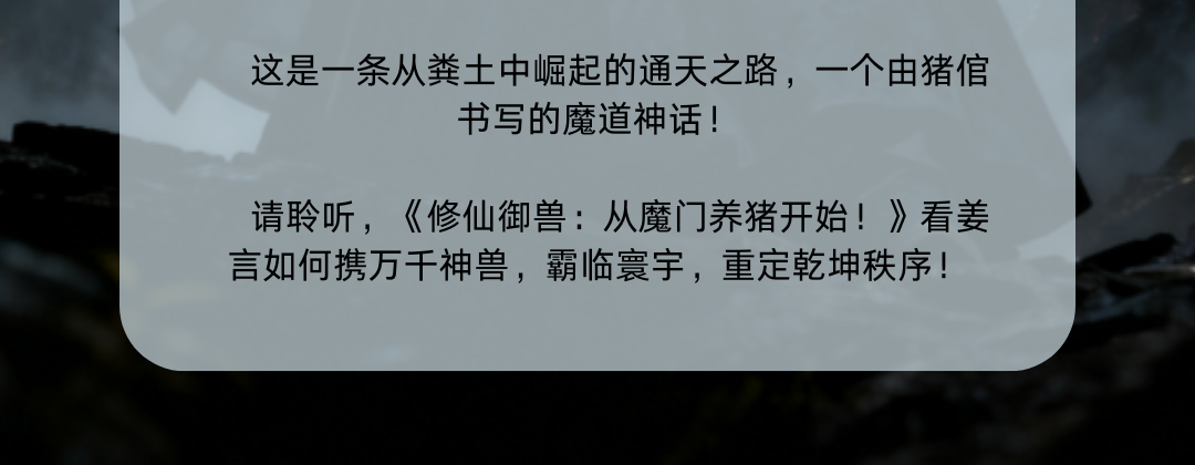 身陷幽罗宗,与猪同眠,草垛为伴。这便是姜言绝境的开局,一个在宗门猪圈里挣扎求生的杂役。 “叮!” 【御兽系统已激活,绑定本命灵兽:黑毛灵猪。】 一道突如其来的光芒,照亮了他的前路!御兽系统降临,万物皆可为伴,万般天赋皆可加身! 从一只人人轻视的猪仔开始,他的灵兽伙伴不断进化,名震诸天! 姜言脚下的层层阶梯,正是由那些曾经轻视他的对手铺就。 姜言:“我曾立誓,定要冲破命运枷锁,得道成仙!” “而如今……我自成天道,我即为至尊!” 这是一条从微末中崛起的通天之路,一个由养猪杂役书写的不朽传奇! 敬请期待,《修仙御兽:从杂役养猪开始!》,看姜言如何携手万千灵兽,威震寰宇,重定乾坤秩序!