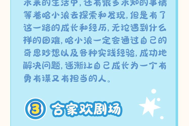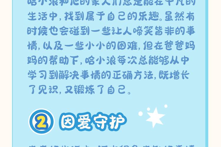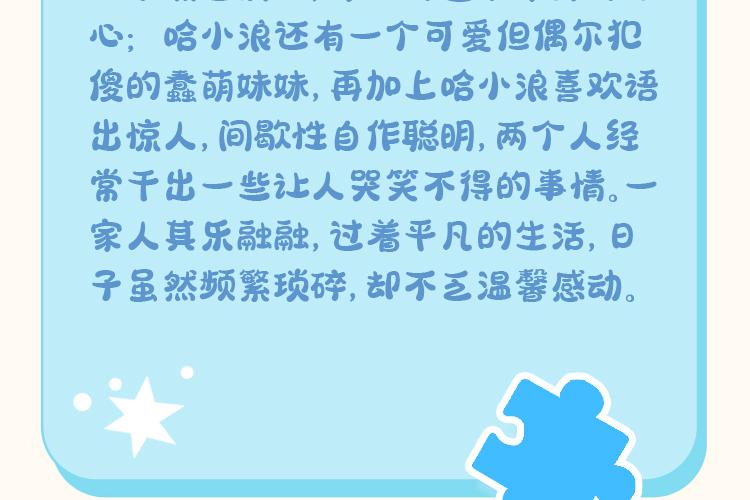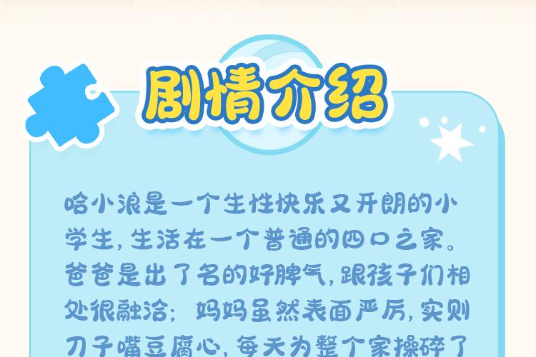 哈小浪是一个生性快乐又开朗的小学生,不仅有着丰富的想象力,而且还经常会语出惊人,是班上的开心果。上学的时光和伙伴们打打闹闹又互相帮助,虽然有时也会自作聪明,把自己变成倒霉蛋,但他还是拥有着乐观的性格,从来不气馁。 哈小浪是一个珍视友谊,热情勇敢的人,非常善于与同学们打成一片,也一起经历过很多有趣的事。他们养过奇奇怪怪的宠物,既培养了生活技能,也培养了爱心;在遇到危机的时刻,他们团结起来,用自己的超能力挫败外星人的阴谋;他们还通过各种方法,帮助同学之间化解矛盾,解决成长过程中遇到的小烦恼,在这样看似平凡的日子里,哈小浪和朋友们一起度过了愉快的上学时光,和同学们一起快乐成长。