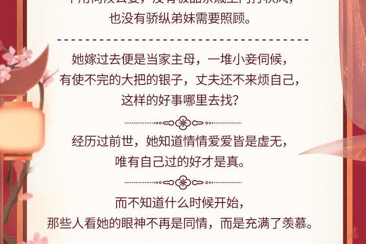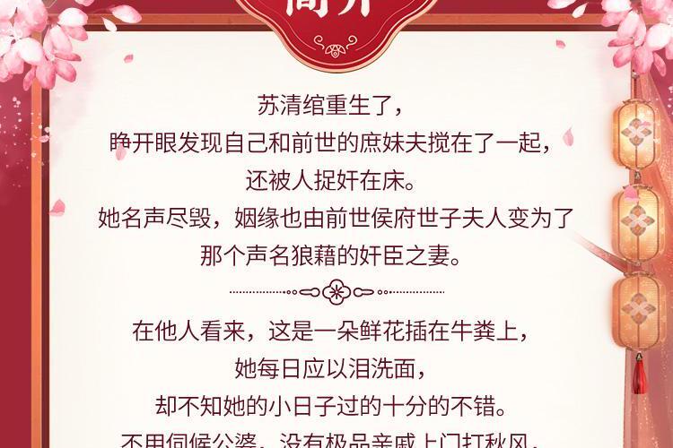 【重生+换亲+宅斗+主母,情绪稳定,头脑清醒,世家女女主;名声败坏,多重马甲宠妻男主。】苏清绾重生了,睁开眼发现自己和前世的庶妹夫搅在了一起,还被人捉奸在床。她名声尽毁,姻缘也由前世侯府世子夫人变为了那个声名狼藉的奸臣之妻。 在他人看来,这是一朵鲜花插在牛粪上,她每日应以泪洗面,却不知她的小日子过的十分的不错。不用伺候公婆,没有极品亲戚上门打秋风,也没有骄纵弟妹需要照顾。她嫁过去便是当家主母,一堆小妾伺候,有使不完的大把的银子,丈夫还不来烦自己,这样的好事哪里去找? 经历过前世,她知道情情爱爱皆是虚无,唯有自己过的好才是真。而不知道什么时候开始,那些人看她的眼神不再是同情,而是充满了羡慕。眼看她的日子越过越好,夫君为她遣散一众妾室,独宠她一人,年纪轻轻便被封了诰命,妹妹嫉妒的红了眼…… 本文立意:日子都是人过出来的,即便一手烂牌也能打出王炸。