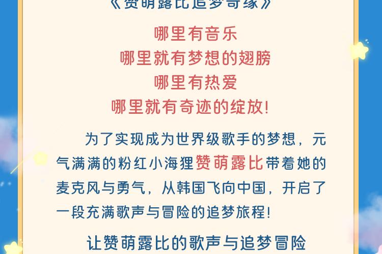 超人气音乐成长冒险故事——《赞萌露比追梦奇缘》 哪里有音乐,哪里就有梦想的翅膀;哪里有热爱,哪里就有奇迹的绽放! 为了实现成为世界级歌手的梦想,元气满满的粉红小海狸赞萌露比带着她的麦克风与勇气,从韩国飞向中国,开启了一段充满歌声与冒险的逐梦旅程!