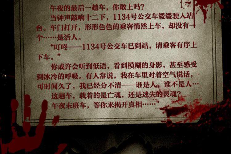 午夜的最后一趟车……形形色色的乘客,却没有一个活人……经常有人跟我说,我在公交车里,和空气讲话,但时间长了,我已经分辨不清楚,究竟谁是人,谁不是人……“叮咚!1134号公交车已到站,请乘客有序上下车。”