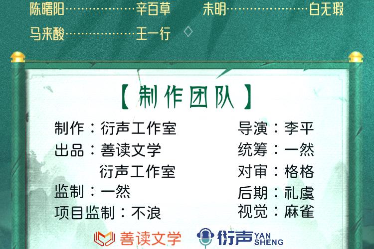 衍声工作室,集编剧、录制、后期制作于一体的专业制作团队,专注国内长音频及有声市场,只做精品,代表作《神武至尊》、《监国太子》