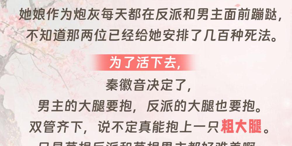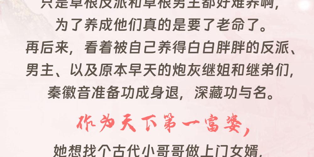 秦徽音穿书了。她娘是连嫁三次的俏寡妇,村里的一枝花。 她娘嫁第二次,她多了一个反派继兄。 她娘嫁第三次,男主成了她的继兄,还有一对早死的炮灰继姐和继弟。她娘作为炮灰每天都在反派和男主面前蹦跶,不知道那两位已经给她安排了几百种死法。为了活下去,秦徽音决定了,男主的大腿要抱,反派的大腿也要抱。双管齐下,说不走真能抱上一只粗大腿。只是草根反派和草根男主都好难养啊,为了养成他们真的是要了老命了。再后来,看着被自己养得白白胖胖的反派、男主、以及原本早天的炮灰继姐和继弟们,秦徽音准备功成身退,深藏功与名。 作为天下第一富婆,她想找个古代小哥哥做上门女婿,从此走上人生巅峰,结果……全京城的媒婆闭门谢客。 摔!砸钱,必须砸钱。