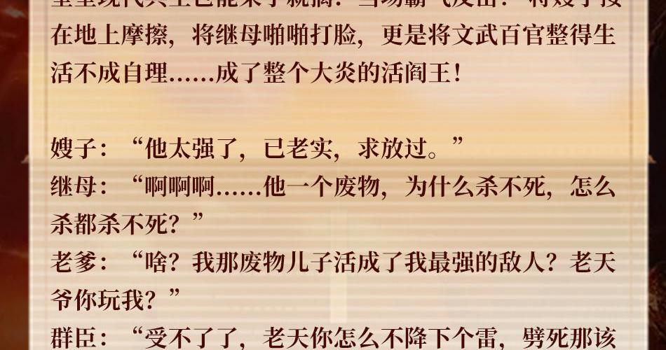 唐逸穿越成古代官二代,开局就在嫂子床上醒来。 还以为好吃不过嫂子,结果直接冲进来一群壮汉,要杀他祭天,唐逸才知道被坑了,这是嫂子和恶毒继母的圈套,想要置他于死地。 堂堂现代兵王岂能束手就擒?当场霸气反击! 将嫂子按在地上摩擦,将继母啪啪打脸,更是将文武百官整得生活不成自理……成了整个大炎的活阎王! 嫂子:“他太强了,已老实,求放过。” 继母:“啊啊啊……他一个废物,为什么杀不死,怎么杀都杀不死?” 老爹:“啥?我那废物儿子活成了我最强的敌人?老天爷你玩我?” 群臣:“受不了了,老天你怎么不降下个雷,劈死那该死的搅屎棍啊!” 皇帝:“嗯,听说有大臣和敌人这段时间太跳?给朕说这个干嘛?关门,放唐逸就行了……”