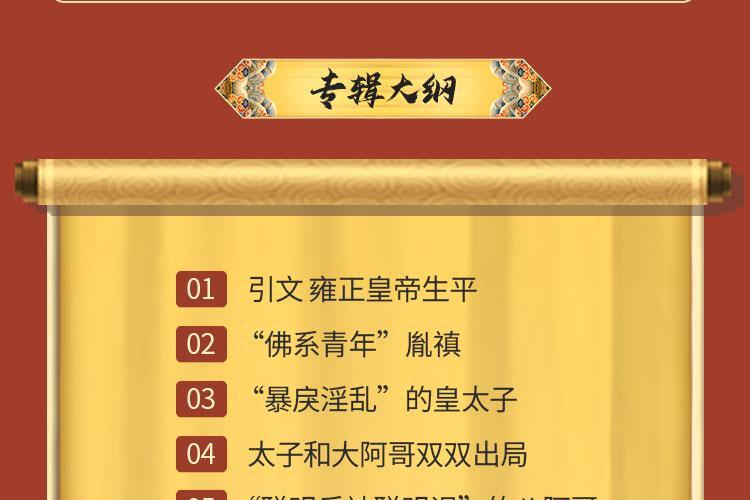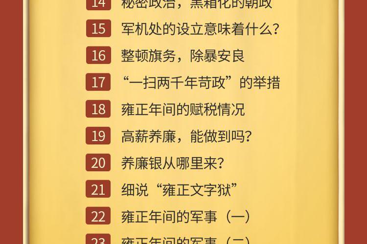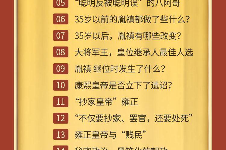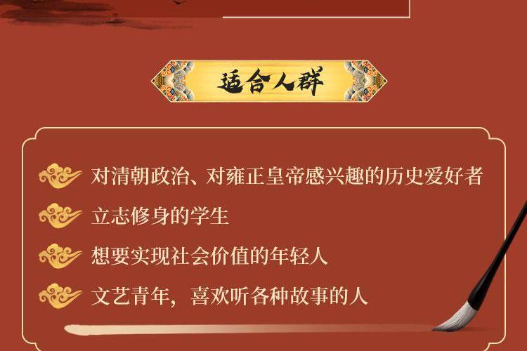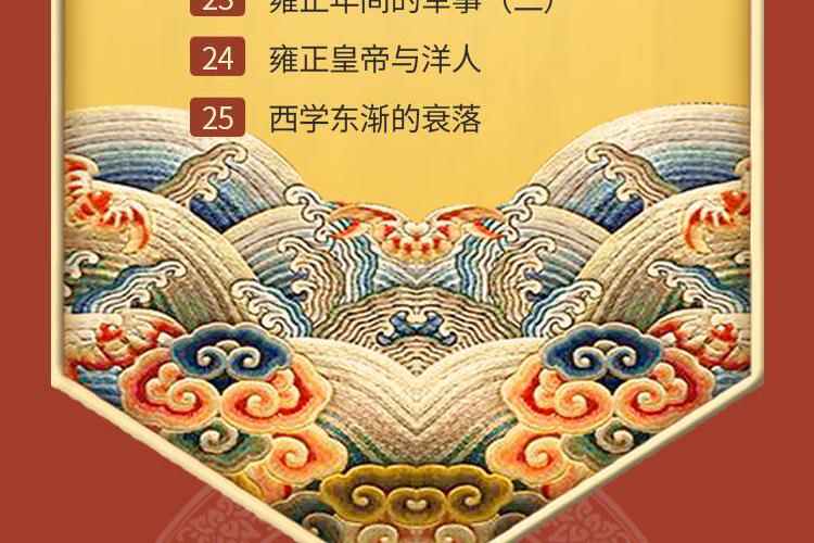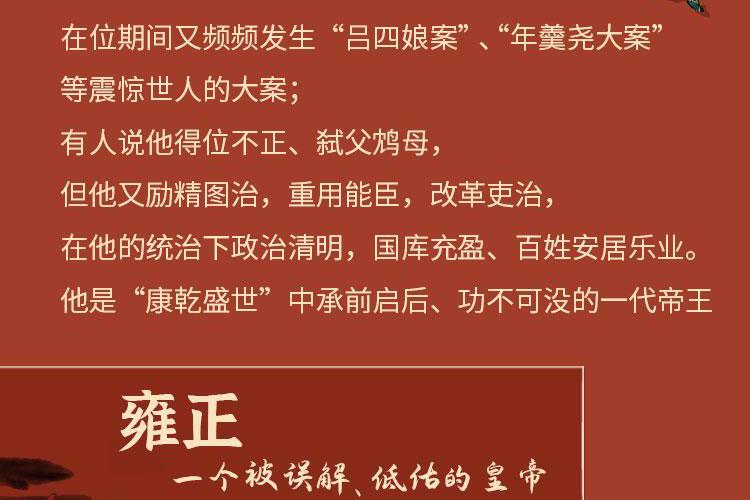 1722年,康熙突然逝世。既无赫赫战功,又无朝野拥戴,平凡得不能再平凡的皇四子雍亲王出人意料地从康熙生前看似精巧的皇位传承安排中突围而出,在一片质疑声中迅速登基。 我们聚焦雍正王朝盘根错节的权力角逐,全面展示雍正王朝的权力的博弈。从雍正的生活、政治手腕、用人等角度去还原一位帝王充满复杂情感与生命张力的人生,解读雍正鲜明的个性是如何晕染了那个时代的政治风气和人文底色,而那个时代又是如何赋予了雍正毁誉参半的人生的。