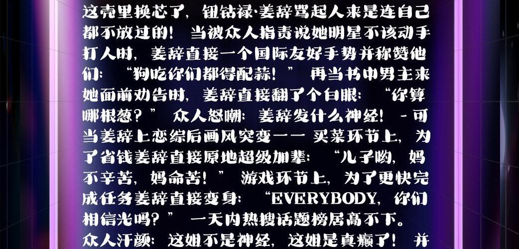 【直播恋综+沙雕+打脸+雄竞+娱乐圈+1v1超甜】 【发癫女明星vs嘴硬心软总裁】 姜辞穿书了,穿到了一个黑红女星身上。 穿的不巧,正好在医院做体检的路上还被人绊了一跤并且造谣说她怀孕伤风败俗。 没人知道这壳里换芯了,钮钴禄•姜辞骂起人来是连自己都不放过的! 当被众人指责说她明星不该动手打人时,姜辞直接一个国际友好手势并称赞他们:“狗吃你们都得配蒜!” 再当书中男主来她面前劝告时,姜辞直接翻了个白眼:“你算哪根葱?” 众人怒嘲:姜辞发什么神经! - 可当姜辞上恋综后画风突变—— 买菜环节上,为了省钱姜辞直接原地超级加辈:“儿子哟,妈不辛苦,妈命苦!” 游戏环节上,为了更快完成任务姜辞直接变身:“everybody,你们相信光吗?” 一天内热搜话题榜居高不下。 众人汗颜:这姐不是神经,这姐是真癫了! 并且还有人提出质疑有谁能降服她,直到看到角落里试图伪装成垃圾桶的总裁…… 众人:这俩绝配顶配天仙配!给我锁死!! 150心率很难达到的程度,偏偏只要她站那,铃声就会随之作响。 嘴硬心软总裁:“其实,我们认识很久了。”