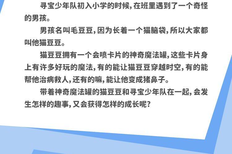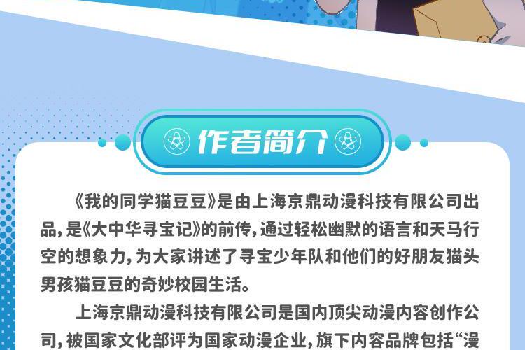 《我的同学猫豆豆》是由上海京鼎动漫科技有限公司出品,改编自大型原创知识漫画“大中华寻宝记系列”漫画,是《大中华寻宝记》的前传,通过轻松幽默的语言和天马行空的想象力,为大家讲述了寻宝少年队和他们的好朋友猫头男孩猫豆豆的奇妙校园生活。 上海京鼎动漫科技有限公司,是国内顶尖动漫内容创作公司,被文化部(今文化和旅游部)评为国家动漫企业,旗下内容品牌包括“漫画中国”系列、《大中华寻宝记》系列、《植物大战僵尸》等耳熟能详的一线动漫作品。其中“大中华寻宝”系列作品图书销量突破8800万册,是目前市场上最受欢迎的童书作品之一。