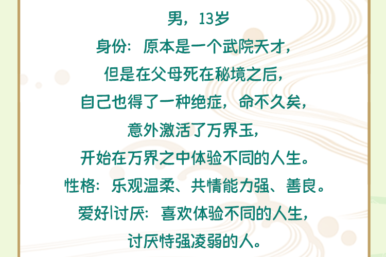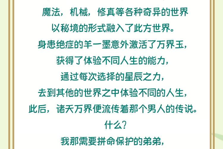 这是一个历史悠久、实力强大的高武世界,是地球的十几倍大,但在十几年前,世界发生了剧变,成为了万界交汇之地,竟逐渐与各种世界发生融合现象,魔法、机械、修真等各种奇异的世界以秘境的形式融入了此方世界。 身患绝症的羊一墨意外激活了万界玉,获得了体验不同人生的能力,通过每次选择的星辰之力,去到其他的世界之中体验不同的人生,此后,诸天万界便流传着那个男人的传说。 什么? 我那需要拼命保护的弟弟,居然成了传说之中的荡魔剑仙? 我那在荒漠里捡的学徒,居然变成了征伐万界的女帝? 我那傲娇的弟子,居然变成了创世至高神?
