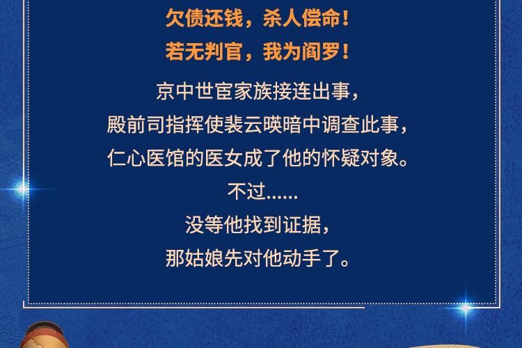 陆曈上山学医七年,归乡后发现物是人非。 长姐为人所害,香消玉殒,兄长身陷囹圄,含冤九泉;老父上京鸣冤,路遇水祸,母亲一夜疯癫,焚于火中。 陆曈收拾收拾医箱,杀上京洲。 欠债还钱,杀人偿命!若无判官,我为阎罗! 京中世宦家族接连出事,殿前司指挥使裴云暎暗中调查此事,仁心医馆的医女成了他的怀疑对象。 不过......没等他找到证据,那姑娘先对他动手了。