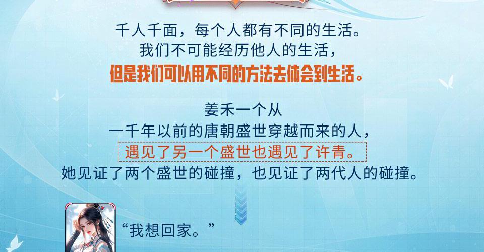 这是一个古代女侠穿越到现代的爱情故事,这个故事有点感人,还有点搞笑。 千人千面,每个人都有不同的生活。跨越1200年的爱情神话,现代人与古代人的同居生活。 姜禾,一个从唐朝盛世穿越而来的人,遇见了另一个盛世也遇见了许青。她见证了两个盛世的碰撞,也见证了两代人的碰撞。 “我想回家。”“你可能回不去了。”“为什么?”“因为这里离你家很远。”“有多远?”“一千二百多年那么远。”