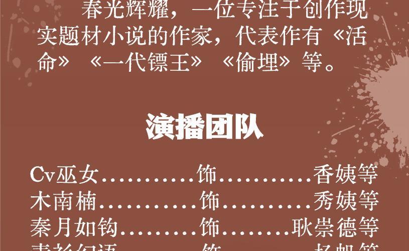 【内容简介】 《香姨》是老白坡三部曲之一,故事以耿家三姐妹的婚恋为主线,大姐香姨因为未婚夫的事得了精神病,嫁给白金玉后,在二妹秀姨的帮助下开班学校也算生活美满,至于二妹因被退婚,从而自己奋斗当上了老板,找到了自己的事业,三妹委姨更是冰雪聪颖,未来夫家因为考上大学来和自己退亲,她没有退让,而是努力争取,迎难而上,勇敢的去战斗。 【作者简介】 春光辉耀,一位专注于创作现实题材小说的作家,代表作有《活命》《一代镖王》《偷埋》等。 【制作团队】 出品:阅米文化 作者:春光辉耀 画本:毛毛蟲 审听:冷月芊芊 美工:木折 演播:Cv巫女、木南楠、秦月如钩、青衫幻语