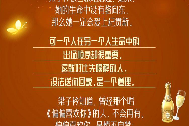 梁子衿很自私地想过,如果,她的生命中没有骆向东,那么她一定会爱上纪贯新。 可一个人在另一个人生命中的出场顺序却很重要。 这就好比先喝醉的人,没法送你回家,是一个道理。 梁子衿知道,曾经那个唱《偏偏喜欢你》的人,不会再有。 偏偏喜欢你,是情不自禁;而我不会再爱你,这是纪贯新的选择。