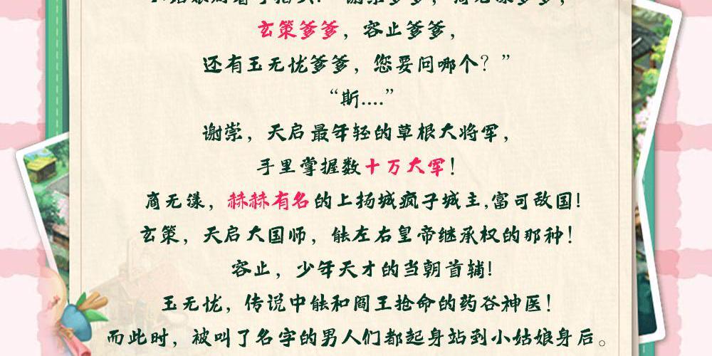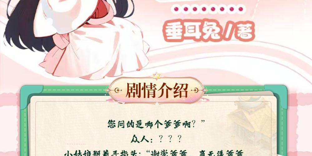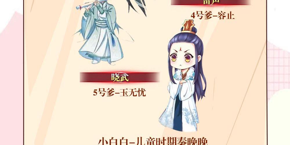 “小家伙,你爹是谁?” 盛大的宫宴上皇帝看着那被自己太子牵着的 漂亮小姑娘问。 众目睽下,秦晚晚弱弱的问:“您问的是哪 个爹爹啊?” 众人:???” 小姑娘眼神无辜的掰着手指头:“谢崇, 商无漾辣,玄策,容止还有玉无忧 爹蒙,您要问哪个?” “斯... 会上所有人倒吸一口凉气。 谢崇,他们天启最年轻的草根大将军,手里学 握数十万大军! 商无漾,那个赫赫有名的上扬城疯子城主,富 可敌国! 玄策,他们天启大国师,能左右皇帝继承权的 那种! 容止,少年天才的当朝首辅,在朝廷有着大半 文官的拥趸! 玉无忧,那个传说中能和阎王抢命的药谷神 医! 而此时被叫了名字的男人们都起身站到小姑 娘身后。 “陛下,您有事?” 他们都默认了。 从此,天启变天了,突然冒出来了个王孙贵族 不能比拟,皇室公主甚至皇子都不敢招惹的小 不点。 偏偏太子和那个小孩的关系很好。 对此其他想争皇位的皇子们咬牙切齿。 “卑鄙的太子!”