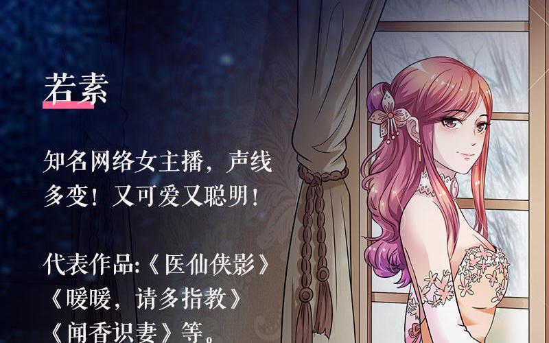 若素,知名网络女主播,声线多变!又可爱又聪明!代表作品:《医仙侠影》、《暖暖,请多指教》、《闻香识妻》等。 霸王,人气cv,声线多变,戏感好,声音低沉有磁性,辨识度强。致力于制作精品。代表作品:《闻香识妻》、《天道编程》、《绝色总裁爱上我》、《那个撬走白月光的蚊子血》等。