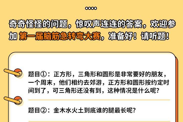 脑筋急转弯,IQ大挑战! 什么人最怕太阳? 什么床不能睡? 超人为什么要穿紧身衣? .... 奇奇怪怪的问题,惊叹声连连的答案,欢迎参加第一届脑筋急转弯大赛,准备好!请听题!