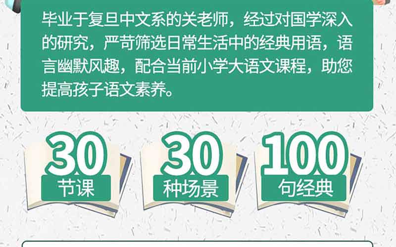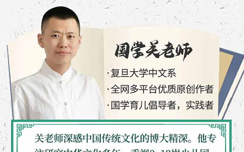 主讲人: 国学关老师 复旦大学中文系 全网多平台优质原创作者 国学育儿倡导者,实践者 关老师深感中国传统文化的博大精深。他专注研究中华文化多年,重视3~12岁少儿国学启蒙与国学知识传播。他通过国学潜移默化的影响孩子的成长,培养优秀孩子。