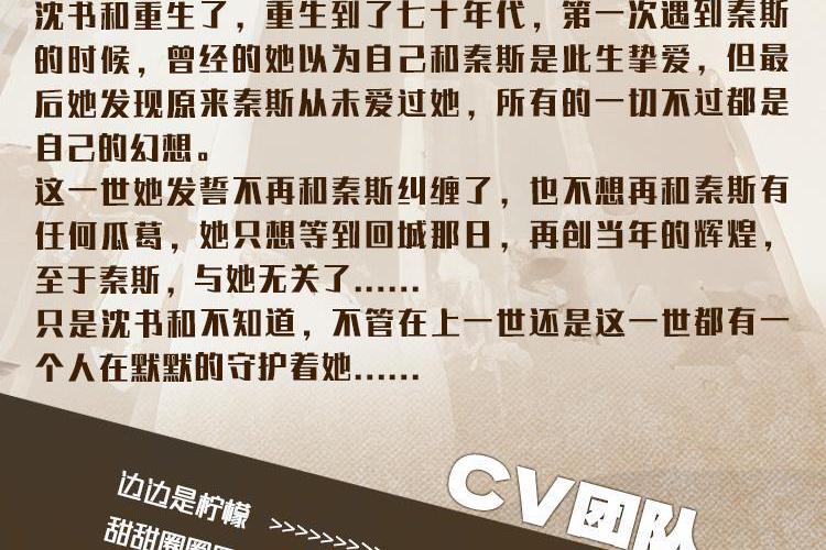 “阿禾,我终于娶到你了!” “原来你口中的阿禾不是阿和。” 沈书和重生了,重生到了七十年代,第一次遇到秦斯的时候,曾经的她以为自己和秦斯是此生挚爱,但最后她发现原来秦斯从未爱过她,所有的一切不过都是自己的幻想。 这一世她发誓不再和秦斯纠缠了,也不想再和秦斯有任何瓜葛,她只想等到回城那日,再创当年的辉煌,至于秦斯,与她无关了...... 只是沈书和不知道,不管在上一世还是这一世都有一个人在默默的守护着她......