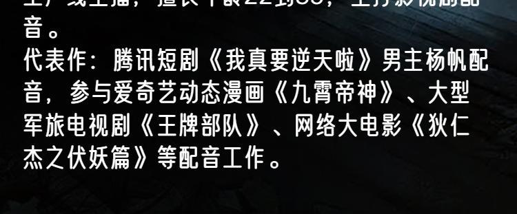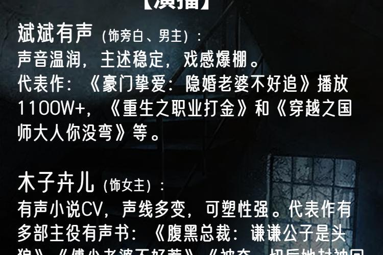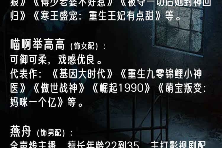 斌斌有声(饰旁白、男主):声音温润,主述稳定,戏感爆棚。 代表作:《豪门挚爱:隐婚老婆不好追》播放1100W+,《重生之职业打金》和《穿越之国师大人你没弯》等。 木子卉儿(饰女主):有声小说CV,声线多变,可塑性强。 代表作有多部主役有声书:《腹黑总裁:谦谦公子是头狼》《傅少老婆不好惹》 《被夺一切后她封神回归》《寒王盛宠:重生王妃有点甜》等。 喵啊举高高(饰女配):可御可柔,戏感优良。 代表作:《基因大时代》《重生九零锦鲤小神医》《傲世战神》《崛起1990》 《萌宝叛变:妈咪一个亿》等。 燕舟(饰男配):全声线主播,擅长年龄22到35,主打影视剧配音。 代表作:腾讯短剧《我真要逆天啦》男主杨帆配音,参与爱奇艺动态漫画《九霄 帝神》、大型军旅电视剧《王牌部队》、网络大电影《狄仁杰之伏妖篇》等配音工作。