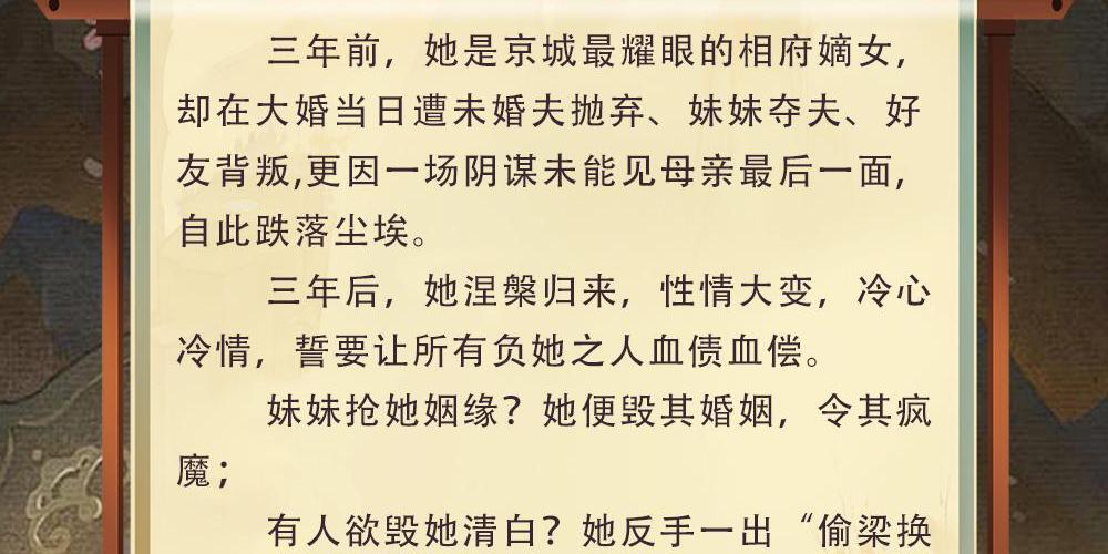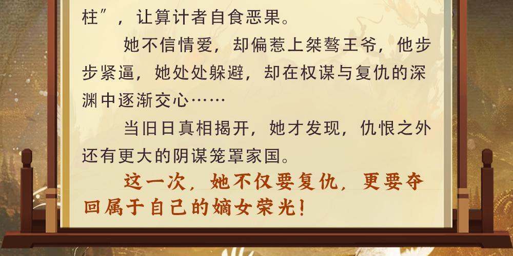 内容简介: 三年前,她是京城最耀眼的相府嫡女,却在大婚当日遭未婚夫抛弃、妹妹夺夫、好友背叛,更因一场阴谋未能见母亲最后一面,自此跌落尘埃。 三年后,她涅槃归来,性情大变,冷心冷情,誓要让所有负她之人血债血偿。 妹妹抢她姻缘?她便毁其婚姻,令其疯魔; 有人欲毁她清白?她反手一出“偷梁换柱”,让算计者自食恶果。 她不信情爱,却偏惹上桀骜王爷,他步步紧逼,她处处躲避,却在权谋与复仇的深渊中逐渐交心…… 当旧日真相揭开,她才发现,仇恨之外还有更大的阴谋笼罩家国。 这一次,她不仅要复仇,更要夺回属于自己的嫡女荣光!