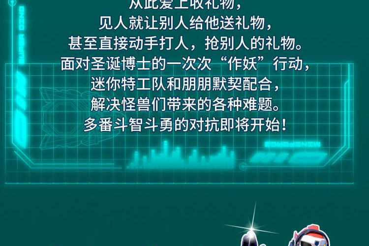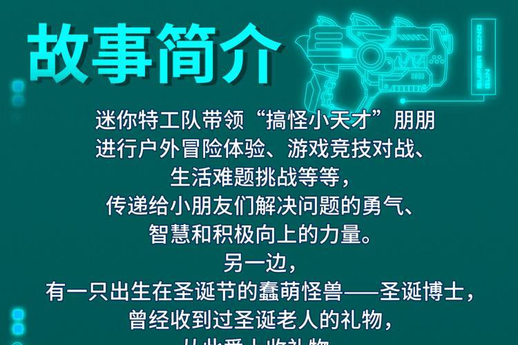 迷你特工队带领“搞怪小天才”朋朋进行户外冒险体验、游戏竞技对战、生活难题挑战等等,传递给小朋友们解决问题的勇气、智慧和积极向上的力量。另一边,有一只出生在圣诞节的蠢萌怪兽——圣诞博士,曾经收到过圣诞老人的礼物,从此爱上收礼物,见人就让别人给他送礼物,甚至直接动手打人,抢别人的礼物。面对圣诞博士的一次次“作妖”行动,迷你特工队和朋朋默契配合,解决怪兽们带来的各种难题。多番斗智斗勇的对抗即将开始!