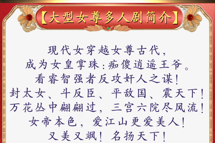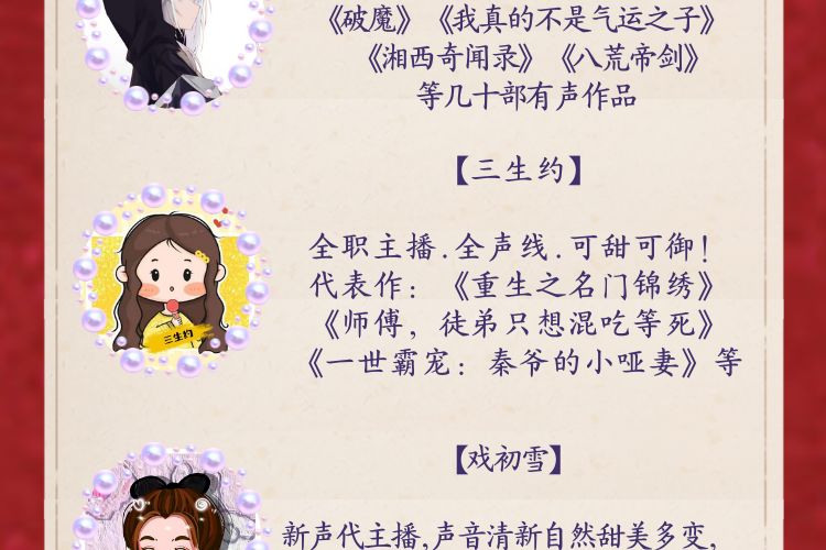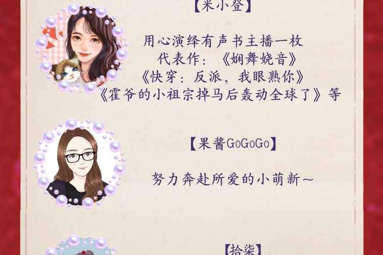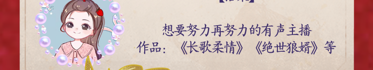 【主播简介】 木槿苏苏:关注我听精品多人剧,用声音与你共鸣;多年全职演播人,成熟统筹监制;代表作:《至尊凰权:江山美男拥入怀》等;参与影视同名小说《幸福到万家》《卿卿我心》《雾楼传》等上百部作品角色配音。