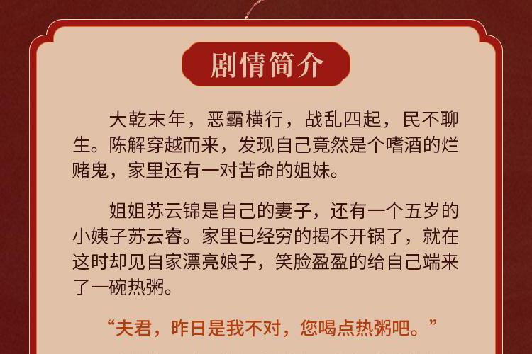 姐姐苏云锦是自己的妻子,还有一个五岁的小姨子苏云睿。家里已经穷的揭不开锅了,就在这时却见自家漂亮娘子,笑脸盈盈的给自己端来了一碗热粥。