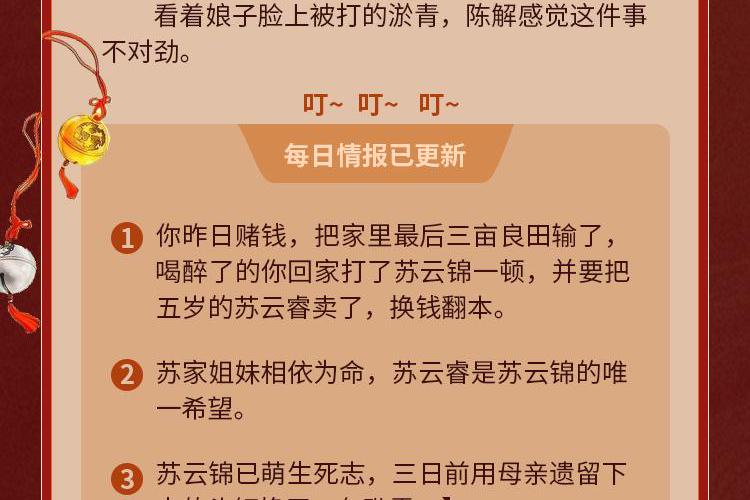 【1.你昨日赌钱,把家里最后三亩良田输了,喝醉了的你回家打了苏云锦一顿,并要把五岁的苏云睿卖了,换钱翻本。】