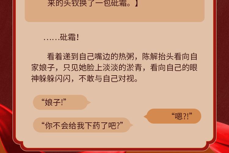 看着递到自己嘴边的热粥,陈解抬头看向自家娘子,只见她脸上淡淡的淤青,看向自己的眼神躲躲闪闪,不敢与自己对视。