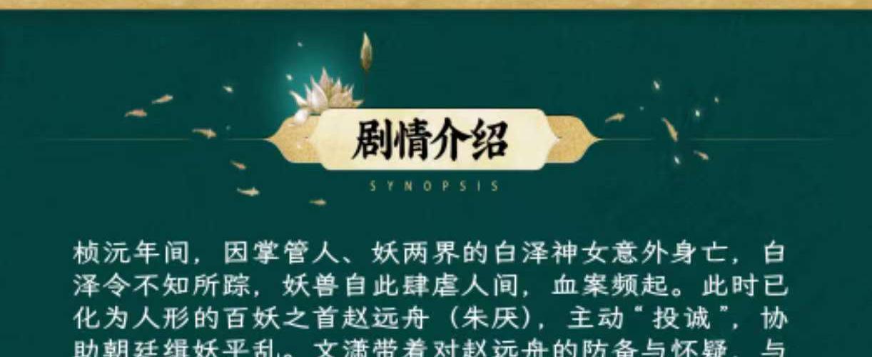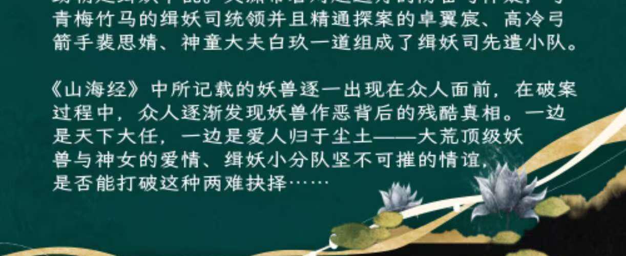 桢沅年间,因掌管人、妖两界的白泽神女意外身亡,白泽令不知所踪,妖兽自此肆虐人间,血案频起。此时已化为人形的百妖之首赵远舟(朱厌),主动“投诚”,协助朝廷缉妖平乱。文潇带着对赵远舟的防备与怀疑,与青梅竹马的缉妖司统领并且精通探案的卓翼宸、高冷弓箭手裴思婧、神童大夫白玖一道,组成了缉妖司先遣小队。 《山海经》中所记载的妖兽逐一出现在众人面前,在破案过程中,众人逐渐发现妖兽作恶背后的残酷真相。一边是天下大任,一边是爱人归于尘土——大荒顶级妖兽与神女的爱情、缉妖小分队坚不可摧的情谊,是否能打破这种两难抉择……