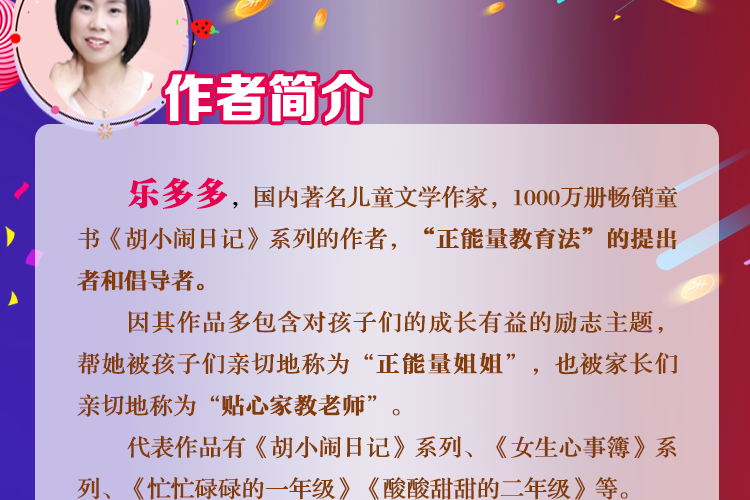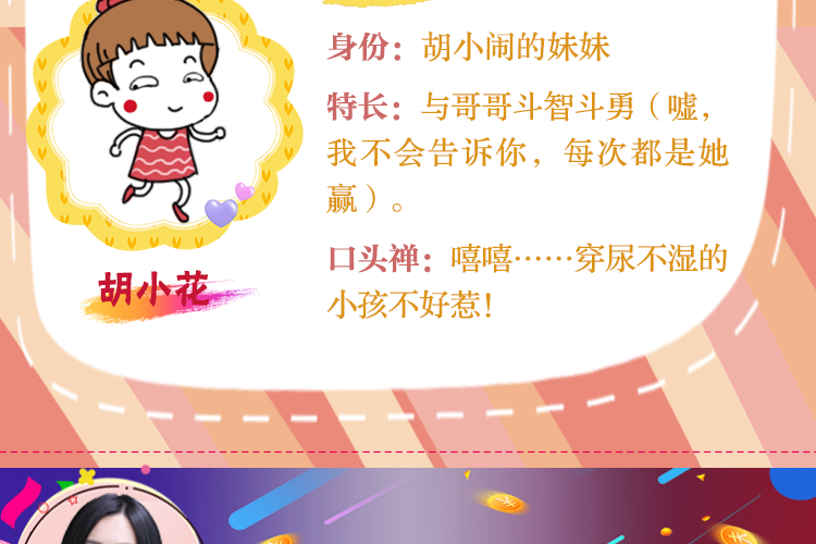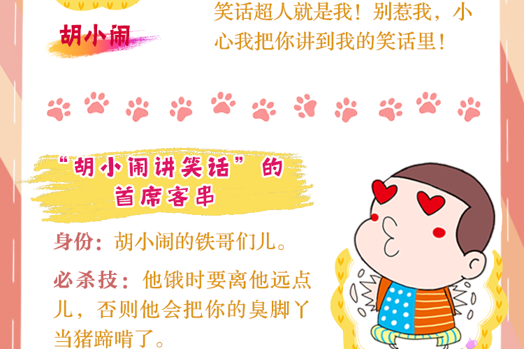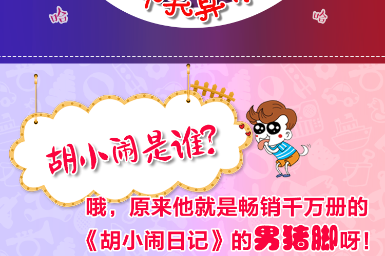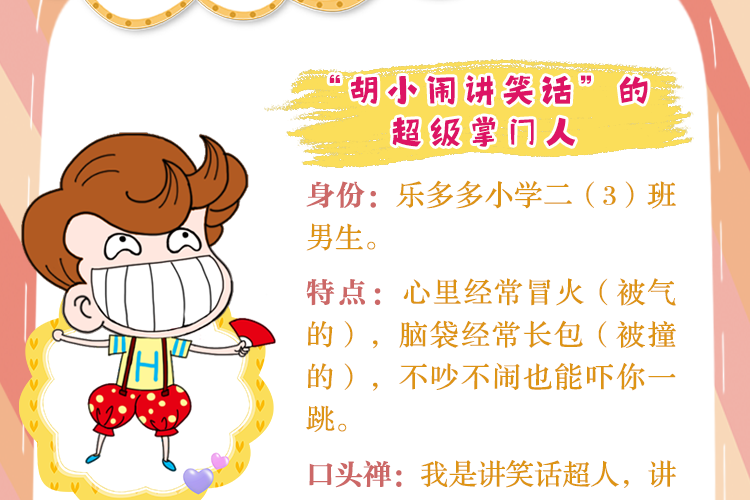 胡小闹,千万畅销童书《胡小闹日记》的主角,代表作品“胡小闹讲笑话”音频专辑。更多胡小闹和他的朋友们的故事,尽在《胡小闹日记》